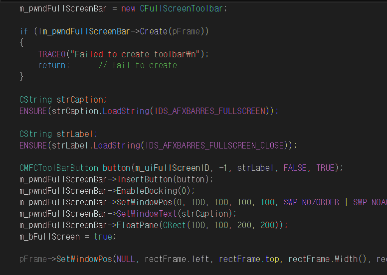 기존 함수는 afxfullscreenimpl.cpp 의 void CFullScreenImpl::ShowFullScreen(CFrameWnd* pFrame) 함수에서 메뉴를 생성함