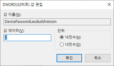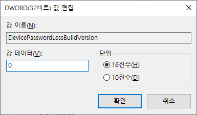 DevicePassword 값을 2 에서 0으로 수정 후