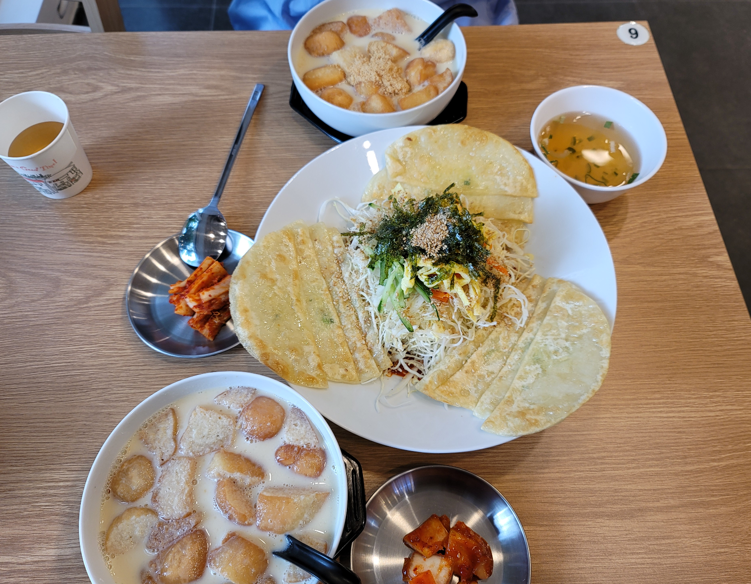 콩국수 국물에 찹쌀도넛튀김? 잘라넣은거같은데