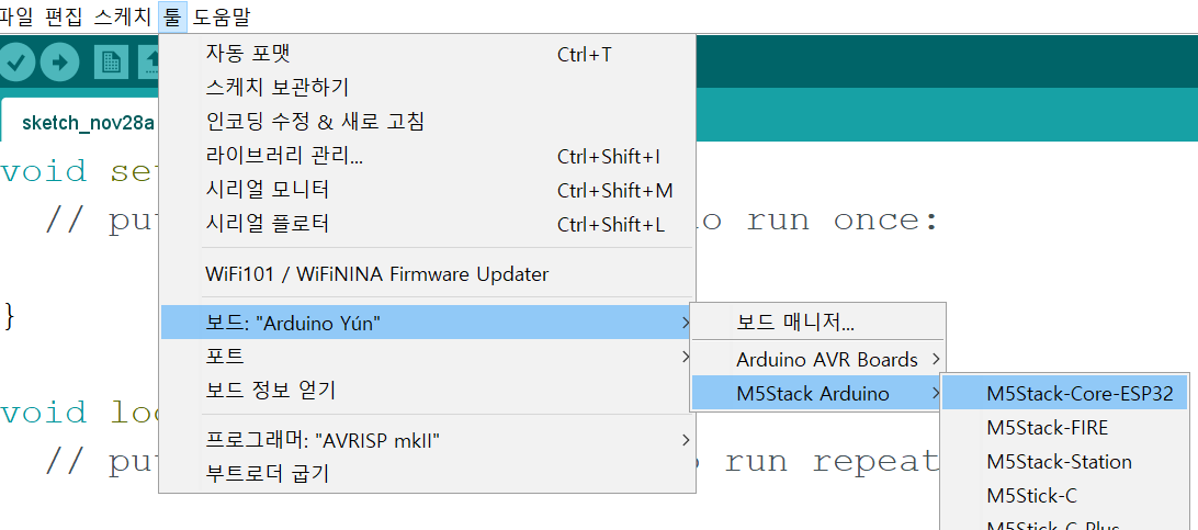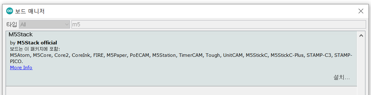 툴 > 보드 > 보드매니저 메뉴에서 M5 로 검색한 후 M5Stack 보드매니저를 설치