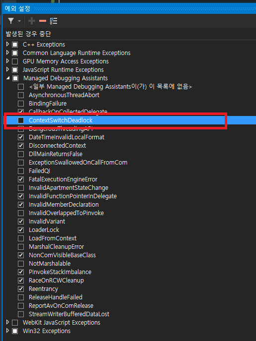 visual studio 메뉴 - 디버그 - 창 - 예외처리 - Managed Debugging Assistants - ContexSwitchDeadlock 체크해제