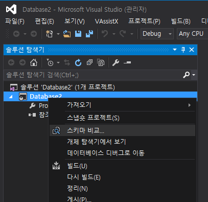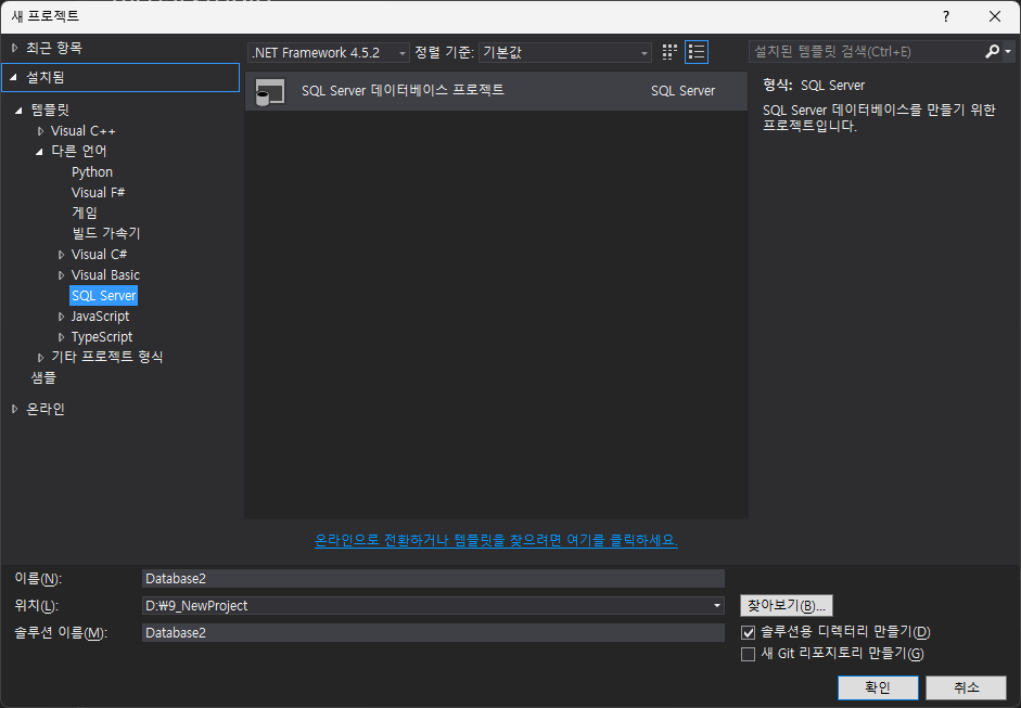 파일 - 새로 만들기 - 프로젝트 - 템플릿 - 다른 언어 - SQL Server - Sql Server 데이터베이스 프로젝트 생성