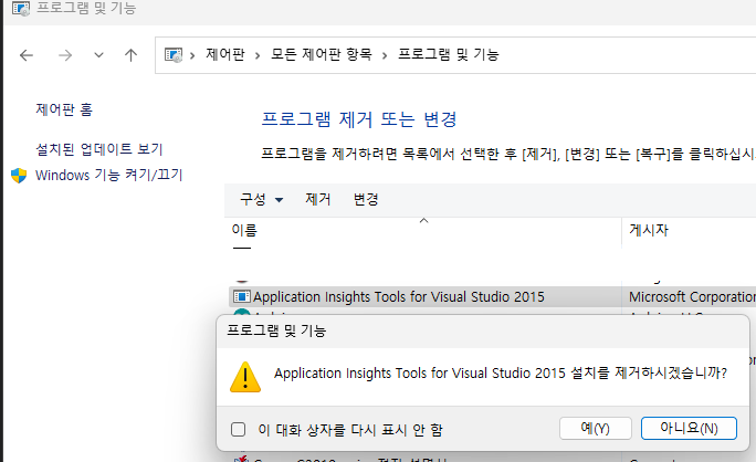 제어판 - Application Insights Tools for Visual Studio 2015 제거