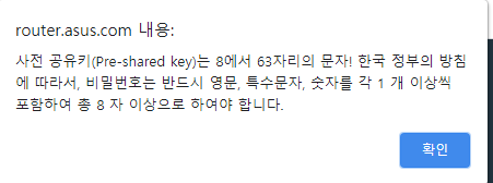 사전 공유키(Pre-shared key)는 8에서 63자리의 문자! 한국 정부의 방침에 따라서, 비밀번호는 반드시 영문, 특수문자, 숫자를 각 1 개 이상씩 포함하여 총 8 자 이상으로 하여야 합니다.