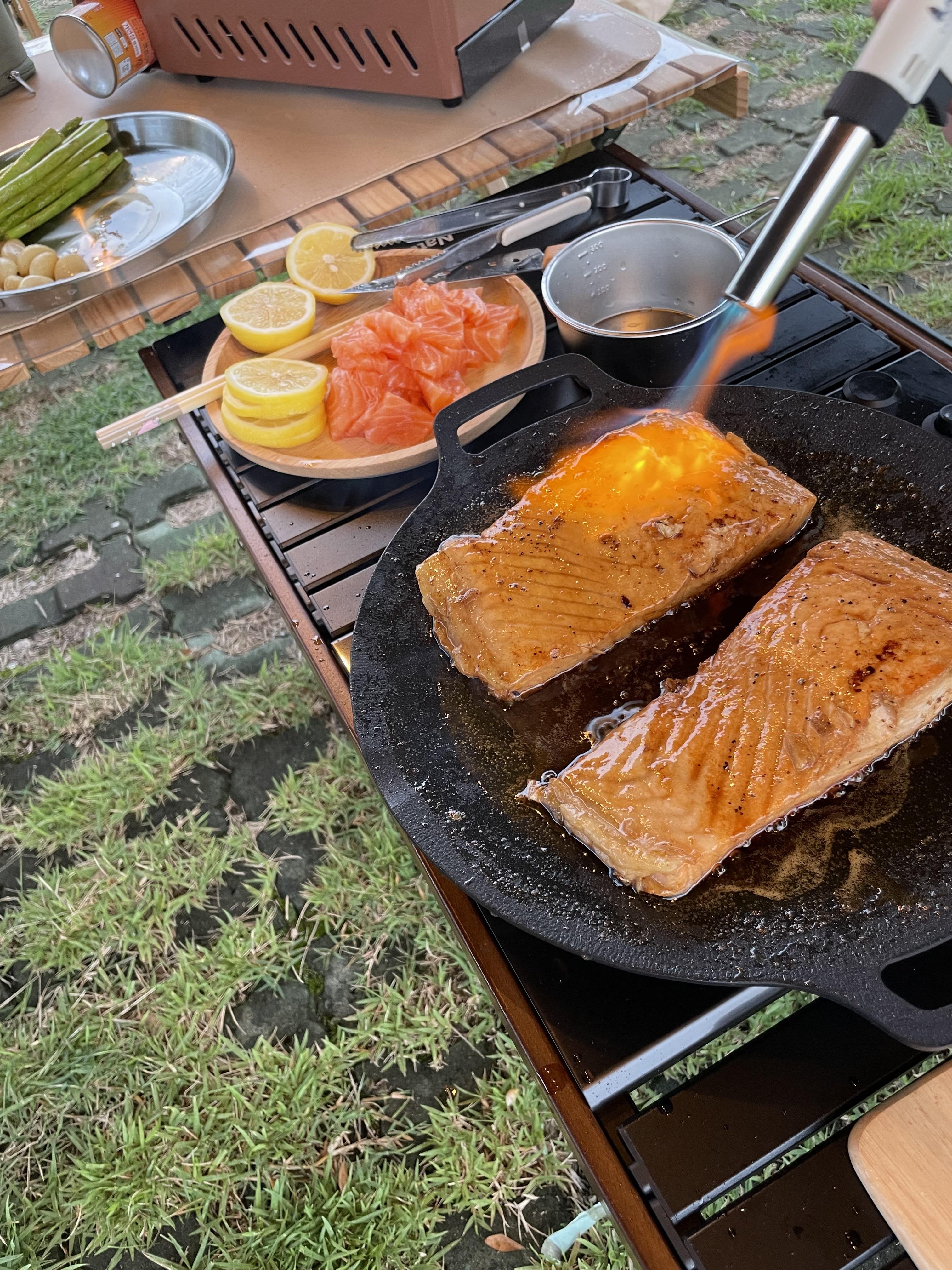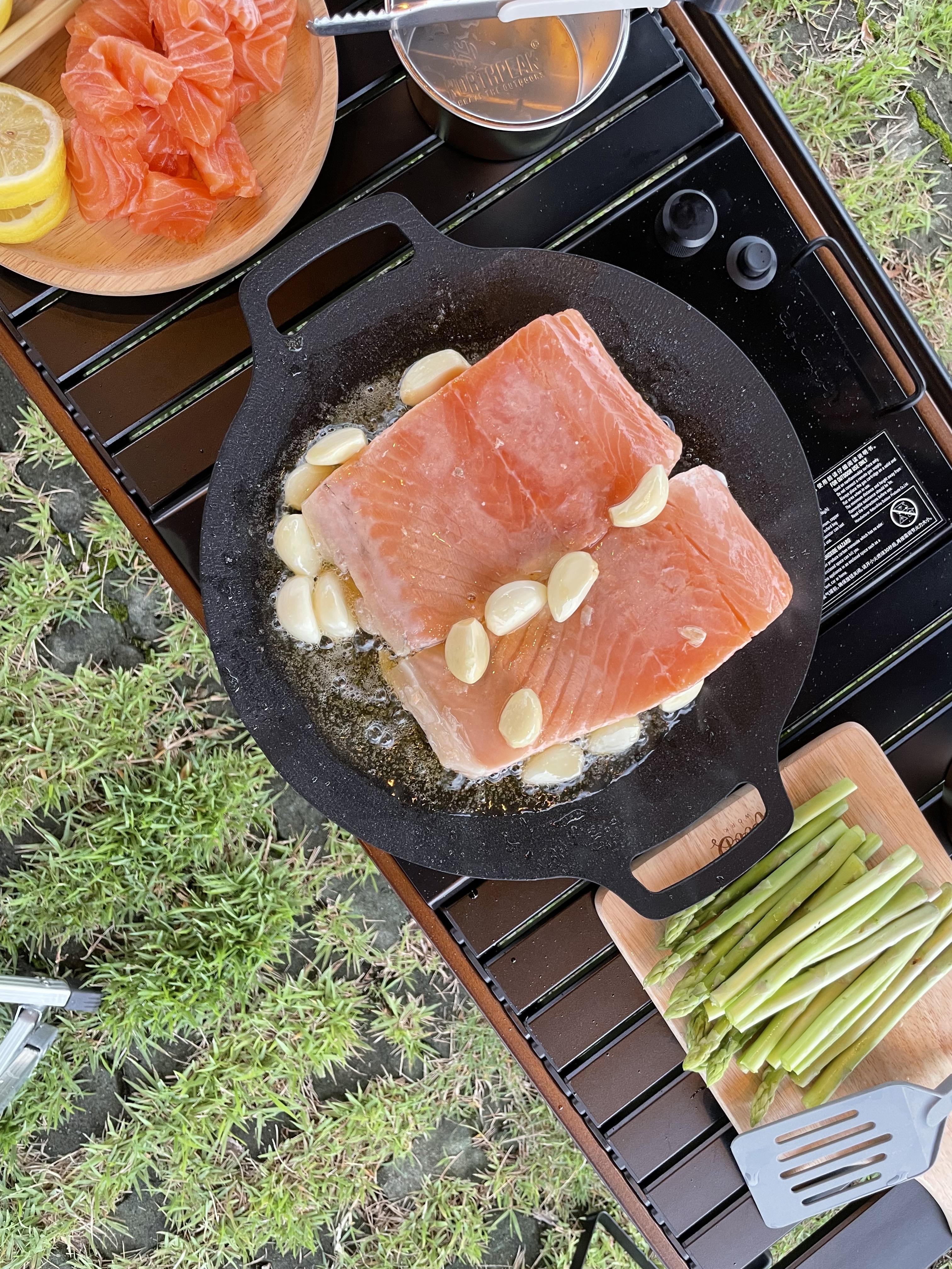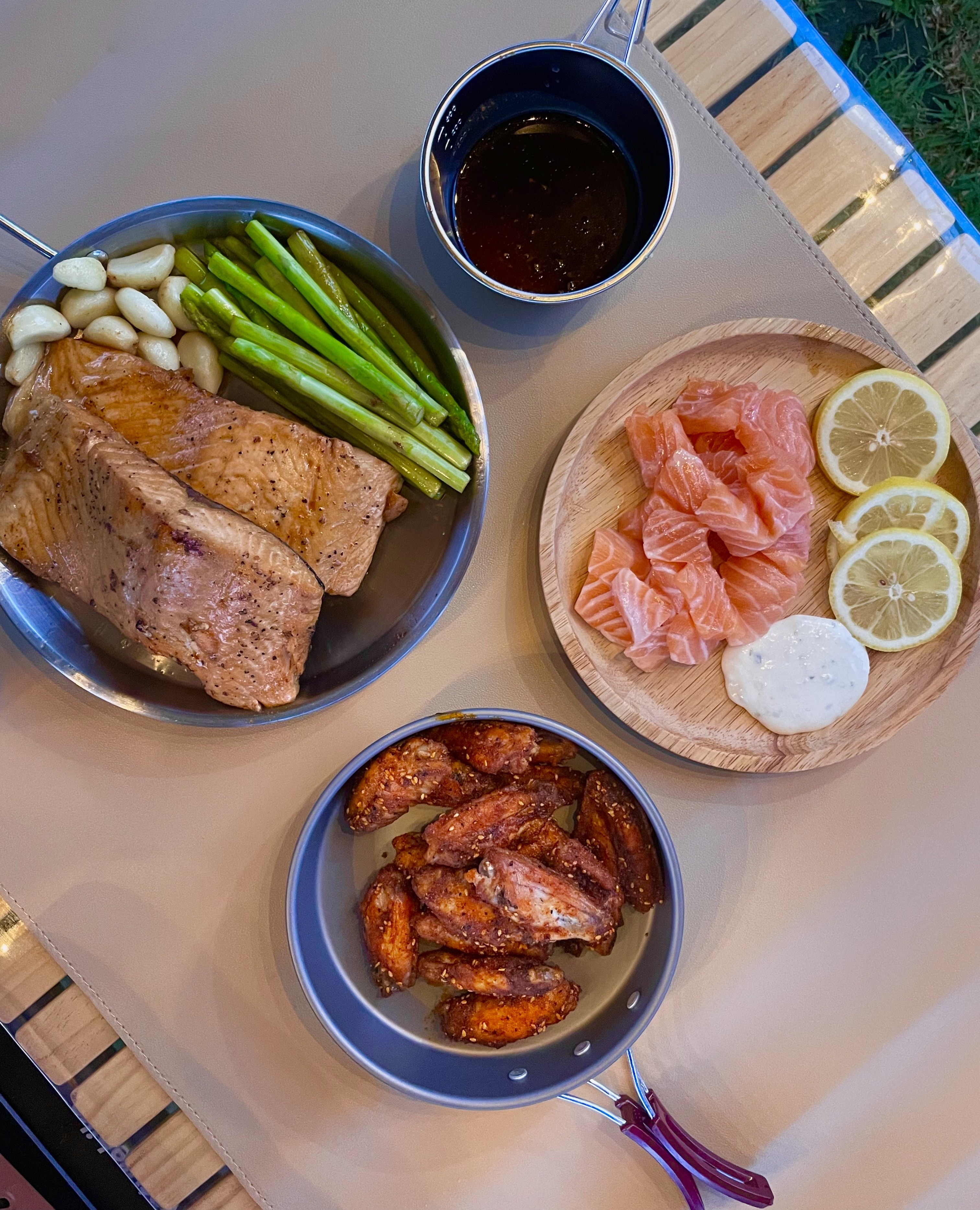 유튜브에 캠핑 요리 치니까 엄청 나오던데 그중에 몇개 골른게 연어스테이크와 닭날개볶음이다