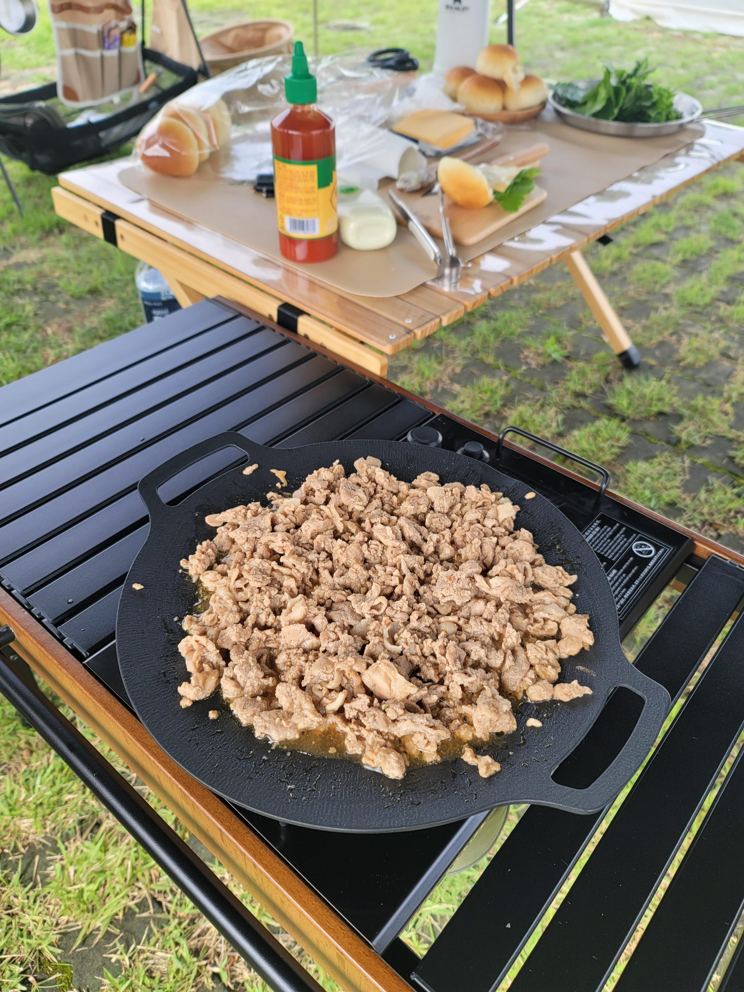 고기 굽고 빵에 야채 치즈 고기 소스를 넣는다
