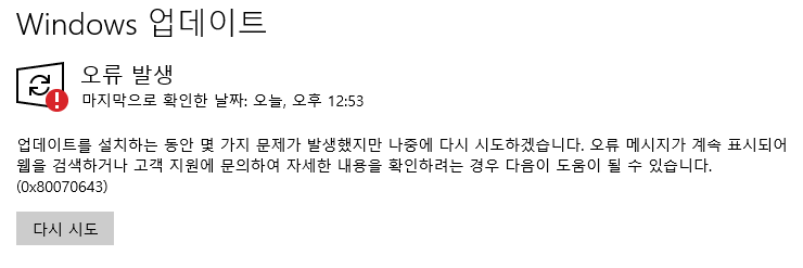 윈도우 업데이트 시 (KB5034441) 오류 (0x80070643) 발생하여 업데이트 안되는 현상