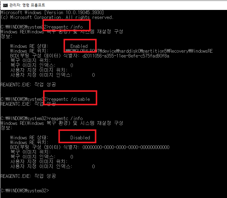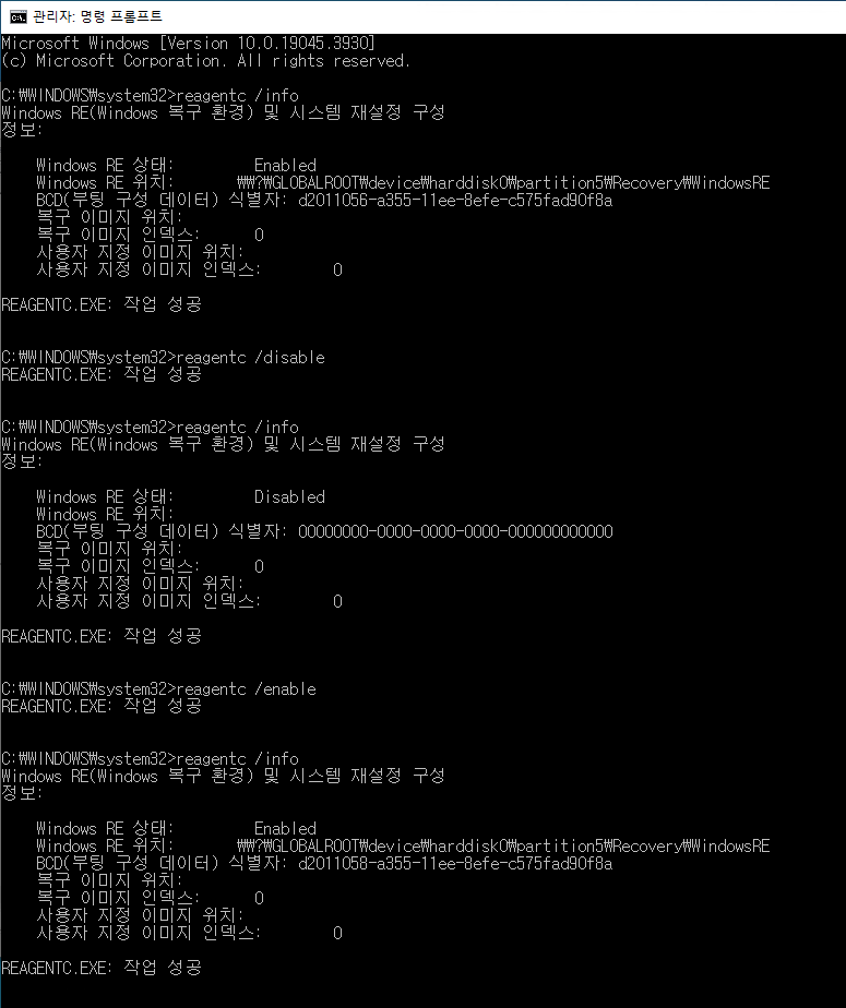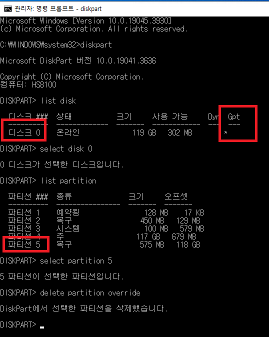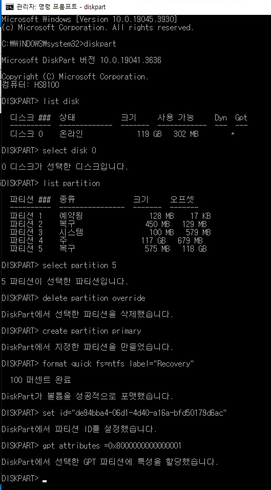 diskpart 입력 이후 순차적으로 입력 - sel disk (복구 파티션이 있는 디스크) - sel part (복구 파티션 번호)