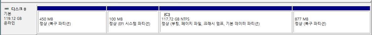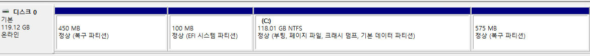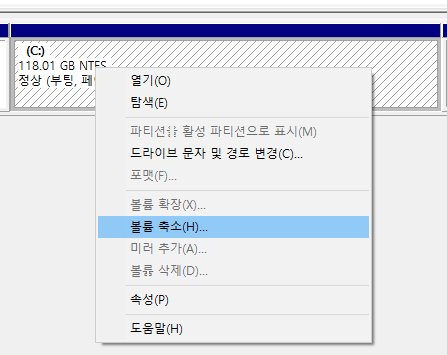 실행 (윈도우 + R) - diskmgmt.msc - C드라이브 우클릭 - 볼륨 축소 - 축소할 공간 입력 : 300 - 축소