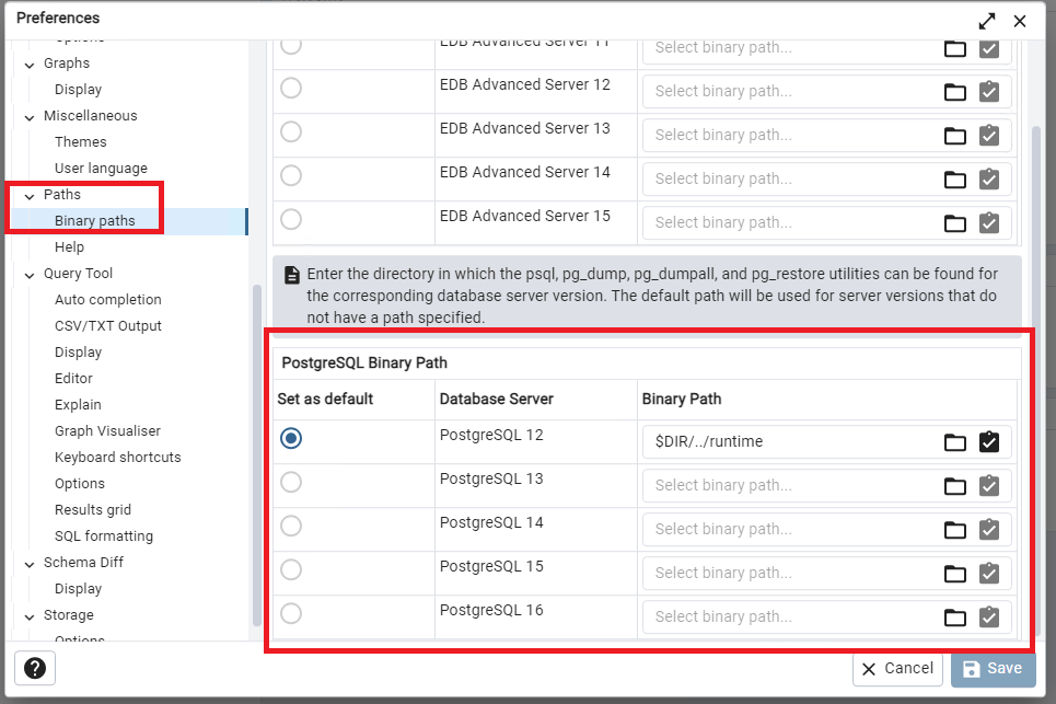 pgAdmin4 - Preferences - Paths - Binary paths