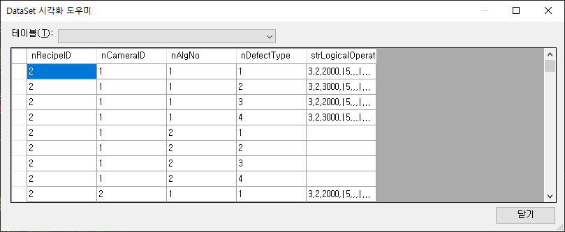 확인하고자 하는 DataTable변수에서 돋보기 모양 클릭 후 DataTable Visualizer 클릭시 시각화도우미 팝업