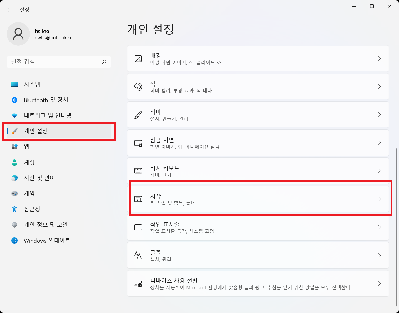 개인설정 - 시작