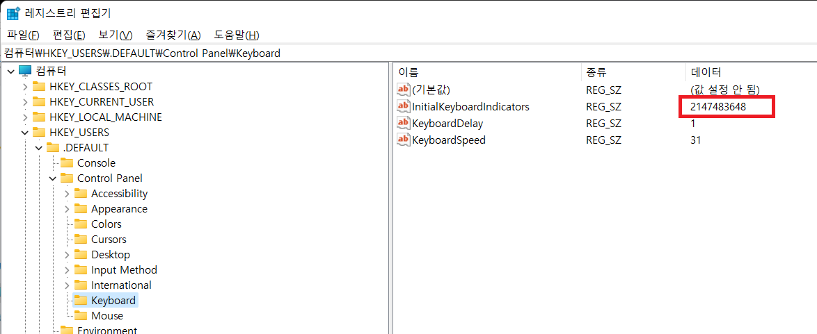 컴퓨터\HKEY_USERS\.DEFAULT\Control Panel\Keyboard