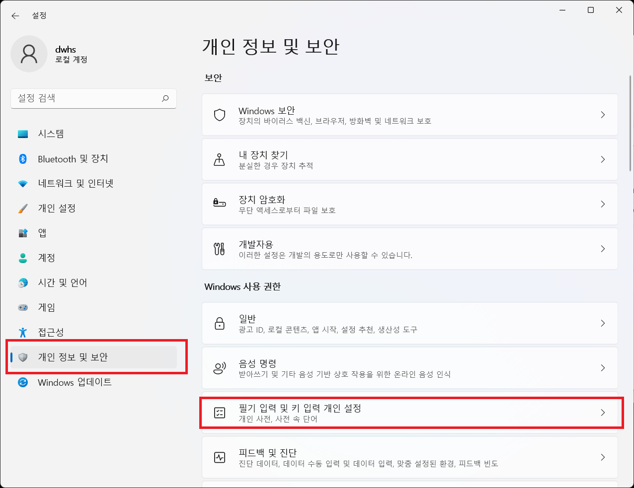 개인정보 및 보안 - 필기 입력 및 키 입력 개인 설정 - 개인잉크 및 입력 사전 끔
