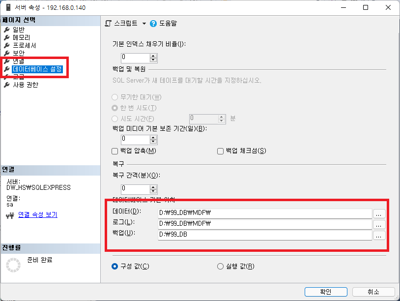 DB우클릭 - 속성 - 데이터베이스 설정 - 데이터베이스 기본위치