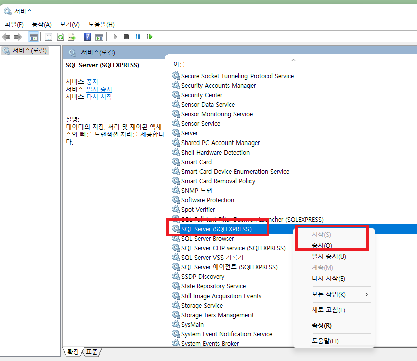 시작 - 서비스 - SQL Server - 중지 - 시작