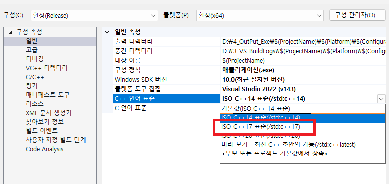 프로젝트 - 속성 - 구성속성 - 일반 - c++언어표준