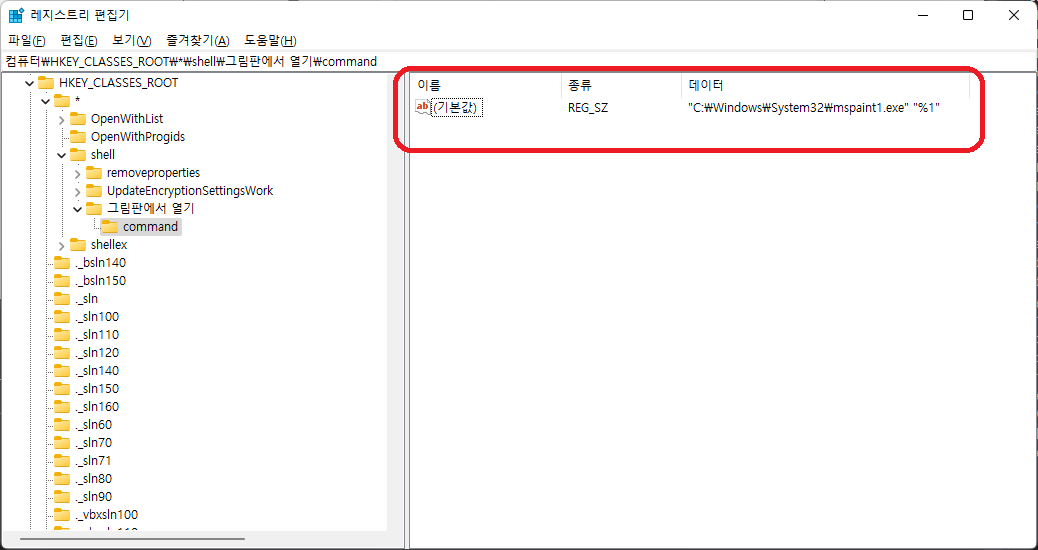 | Windows Registry Editor Version 5.00 [HKEY_CLASSES_ROOT\*\shell\그림판에서 열기] [HKEY_CLASSES_ROOT\*\shell\그림판에서 열기\command] @="\"C:\\Windows\\System32\\mspaint1.exe\" \"%1\"" |