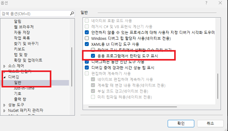 응용 프로그램에서 런타임 도구 표시 체크해제