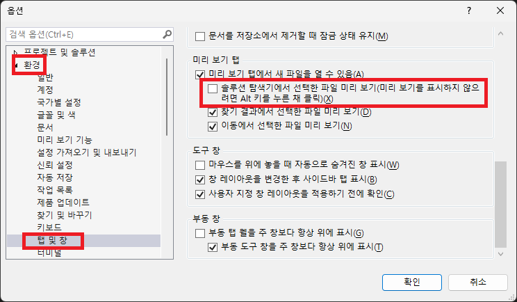 도구 - 옵션 - 환경 - 탭 및 창 - 미리보기 탭